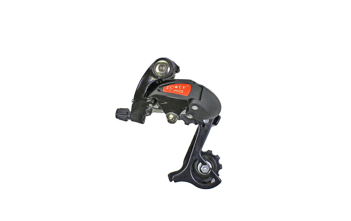 Переключатель задний POWER, крепление под болт "на петух", для 6 скоростей, короткая лапка, ёмкость 28Т, серебристый